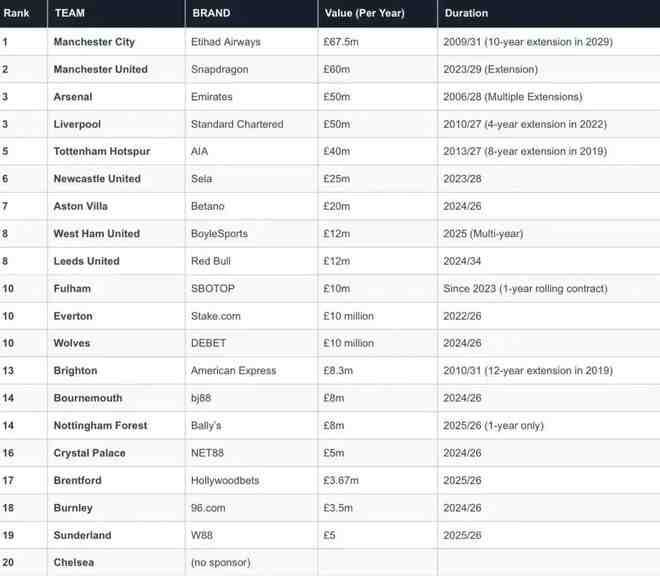 2025-26賽季英超胸前廣告贊助情況一覽