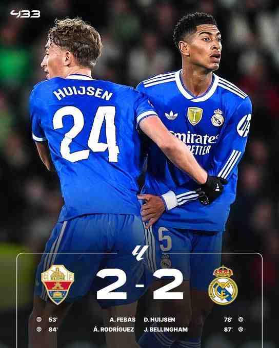 北京時間11月24日04:00,西甲聯賽第13輪,皇家馬德里客場挑戰埃爾切。上半場雙方均無建樹。皇馬半場0-0戰平埃爾切。下半場,費巴斯首開紀錄,赫伊森扳平,打進他在皇馬的首個進球,隨后阿爾瓦羅-羅德里格斯打進一球,貝林厄姆破門扳平比分。全場比賽結束,埃爾切2-2皇馬,聯賽兩連平。目前僅1分優勢領跑積分榜。