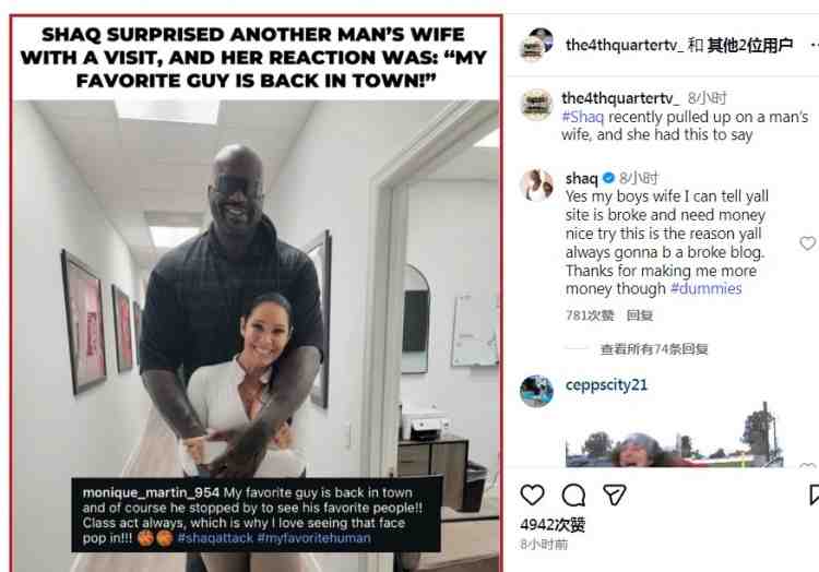 12月8日訊 近日一位有夫之婦Monique Martin在社媒曬出一張圖片,其中她和奧尼爾熱情相擁。