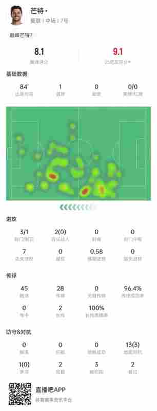 芒特本場數據:3次射門打進1球,傳球成功率96.4%,獲評8.1分