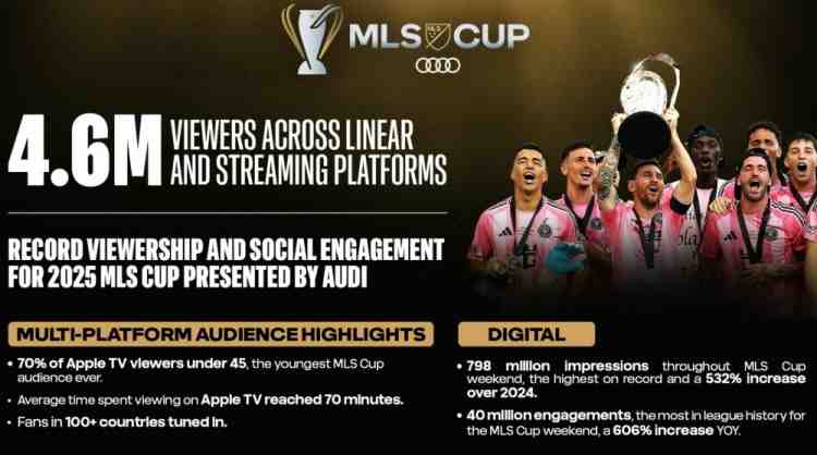 美職聯官方確認,邁阿密國際對陣溫哥華白浪的總決賽在所有平臺吸引了460萬名觀眾。社交媒體曝光量達7.98億次,同比增長532%。