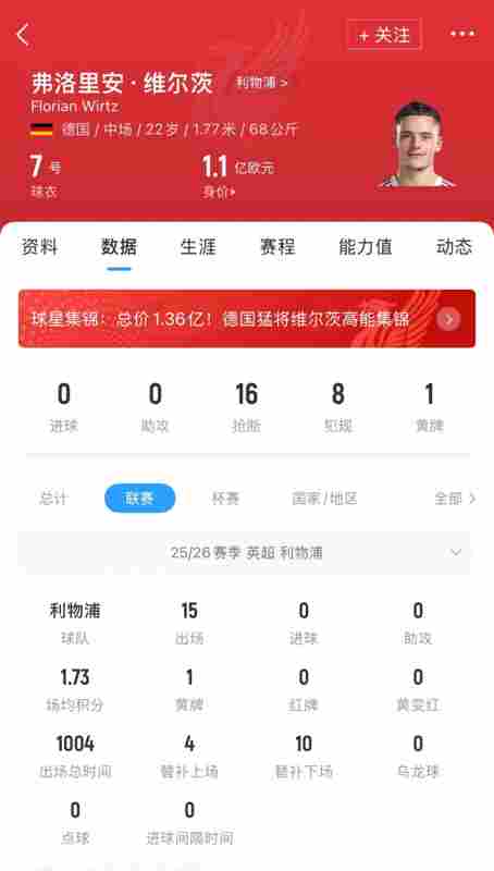 本賽季維爾茨各賽事代表利物浦出場21次,貢獻4次助攻但沒有進球,15輪英超過后依然0球0助。